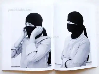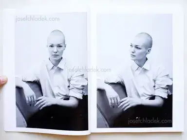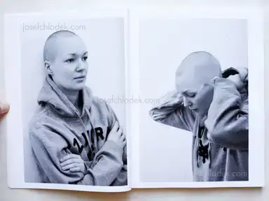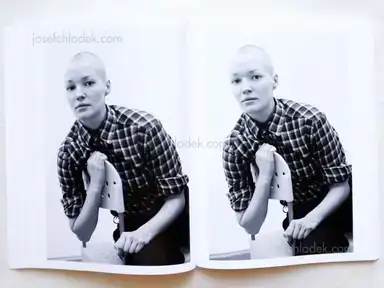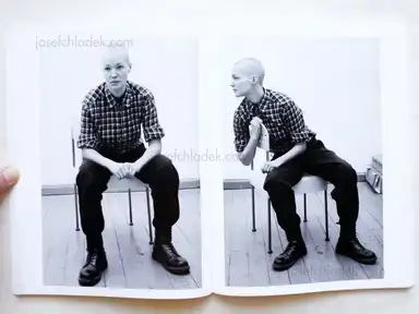 „Figure I and Figure II are two young women who immediately confuse the viewer. Figure I is photographed against a neutral background, striking various different poses and dressed in an assortment of clothes that make it impossible to ascribe her a fixed role. Depending on which photograph you are looking at, the figure may look more female or more male — there is no way to resolve the ambiguity. The same is true for Figure II: she stands in front of a lamella curtain, trying on a tube cowl. As with Figure I, there can be no clear-cut role assignment, which is the effect Steinbach is striving for. His two black-and-white portrait series ask the viewer to look carefully and make comparisons — reminiscent of Marianne Wex’s photo studies. The artist plays with the gestural language of fashion photography, which he repeatedly subverts, paring away at the image to reveal the »residual identities« of his models.“