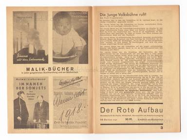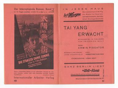 Mit dem Besetzungszettel zu Friedrich Wolf 'Tai Yang erwacht'. Schauspiel in 7 Bildern. Regie: Erwin Piscator. Bühnenbild und Kostüme: John Heartfield. Musik: Herbert Breth Mildner. Choreographie: Hanns Weidt. Aufführung in der Jungen Volksbühne / Wallner Theater, 1931. Mit Beiträgen 'Die Junge Volksbühne ruft! / Erwin Piscator 'Das Zeittheater in der Krise' / Friedrich Wolf 'Die fünfte Macht' / Oh Tsang 'Die Lage der chinesischen Arbeiterklasse' u.a., Verlagsanzeigen des Malik Verlags. Einbandgestaltung und Druckanordnung John Heartfield sowie der Text „Die Dekorationen sprechen“.