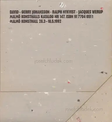 Four catalogues in recycled cardboard foldout sleeve. Catalogue 1 with text by Jaques Werup, catalogue 2 by Dawid, catalogue 3 by Gerry Johansson, catalogue 4 by Ralph Nykvist. Catalogue to the exhibition Från Skåne at the Malmö Konsthall, Malmö, Sweden 1992. Design by Gerry Johansson.