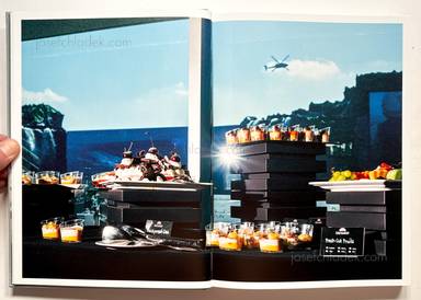 Teryoshin deliberately obscures the faces of the business men and women present as it is not his intention to fix blame on individuals. Thea nonymised arms dealers can be seen as a metaphor for a business operating in the shadows and under the radar of the media. His photographs are playful and often focus on bold graphic angles and visual humour such as drinks put down alongside machine guns and geopolitics tote bags. The casual nature of his observations combined with the bright innocent colour palette which runs throughout the imagery is a sinister contrast to the goods on sale. Teryoshin’s use of flash helps him to highlight certain elements and is reminiscent crime scene photography.